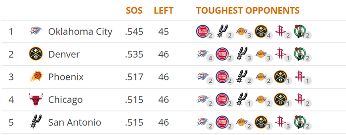 此外,NBA杯赛结束后,雷霆队在19天内打了11场比赛,而不敌黄蜂队的这场球,是他们背靠背的第二场,也是西海岸客场之旅后四天内的第三场比赛。更严峻的是,雷霆队剩余赛程的难度高居联盟首位,对手的平均胜率达到54.5%。